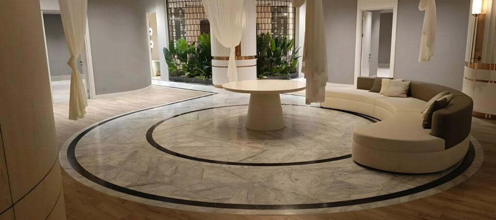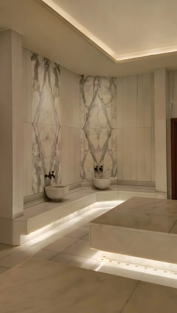 Tesis içerisinde yer alan Türk hamamı alanlarında da doğal taşın sıcaklıkla etkileşimi, kaymaz yüzey özellikleri ve ısıyı tutma kapasitesi dikkate alınarak özel seçimler yapıldı. Özellikle Marmara mermeri, yapısal olarak yüksek sıcaklıklara karşı dirençli olması ve homojen damar yapısıyla bu alanlarda sıklıkla tercih edildi. Efesus Stone uzmanlığıyla yapılan bu uygulamalar, yalnızca işlevsel değil, aynı zamanda geleneksel estetik anlayışla da bütünlük oluşturdu.